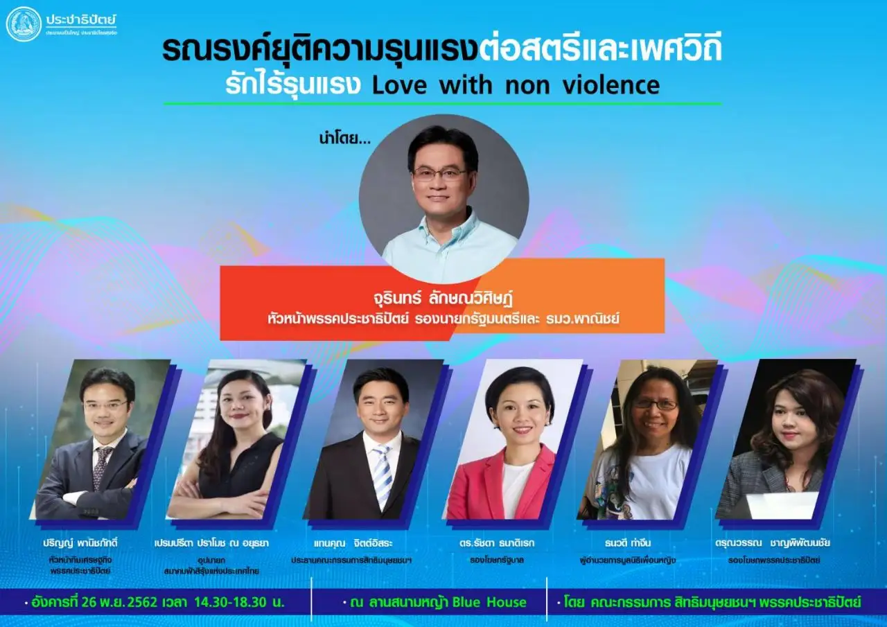 อั้ม แอบแซ่บ ที่ปรึกษานักการเมืองป้ายแดงร่วมงานรณรงค์ยุติความรุนแรงต่อสตรีและเพศวิถี ท่านจุรินทร์ ลักษณวิศิษฎ์ หัวหน้าพรรคประชาธิปัตย์ รองนายกรัฐมนตรีและรัฐมนตรีว่าการกระทรวงพาณิชย์ เปิดงานรณรงค์ยุติความรุนแรงต่อสตรีและเพศวิถี ท่านดร.คุณหญิงกัลยา โสภณพนิช รัฐมนตรีช่วยว่าการกระทรวงศึกษาธิการ ร่วมพูดบนเวที พี่อี้ แทนคุณ ที่ปรึกษารัฐมนตรีว่าการกระทรวงพาณิชย์ เป็นโต้โผ และแม่แดนนี่ นายกสมาคมฟ้าสีรุ้ง ร่วมเป็นภาคีเขื่อข่าย โดยมีคนบันเทิงร่วมเป็นสักขีพยานอาทิ คุณธิรดา เสมสำราญ มิสแกรนด์นนทบุรี2018 คุณพงศ์ชิษณุ พีรดาจิราวัฒน์ (เฟร) President ผู้ผลิตละคร The survivor production จุรินทร์ ดัน ‘ประชาธิปัตย์’ ขับเคลื่อน 3 ข้อ ส่งเสริมความเสมอภาคระหว่างเพศ LGBT นายจุรินทร์ ลักษณวิศิษฏ์ หัวหน้าพรรคประชาธิปัตย์ รองนายกรัฐมนตรีและรัฐมนตรีว่าการกระทรวงพาณิชย์ เป็นประธานเปิดการรณรงค์ยุติความรุนแรงต่อสตรีและเพศวิถี โดยกล่าวว่า การเสวนาวันนี้ขอฝากการบ้านให้ทุกฝ่ายและทุกคนคิดทำการบ้าน 3 ประเด็นเพื่อช่วยหาคำตอบจะทำอย่างไรที่จะส่งเสริมความเท่าเทียมระหว่างเพศให้เกิดขึ้นได้ ในโลกความเป็นจริงและเป็นรูปธรรม อ่านต่อ : https://www.democrat.or.th/newsDetail/1019 -- ติดตามข่าวสารเพิ่มเติมได้ที่ Instagram : Democratparty.th Twitter : @democratTH YouTube : พรรคประชาธิปัตย์ Democrat Party, Thailand #DemocratPartyTH #พรรคประชาธิปัตย์