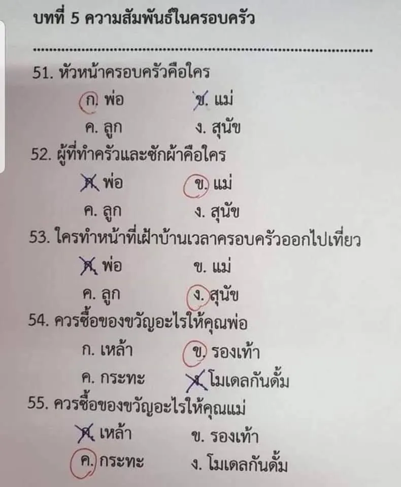 ข้อ 55.) ควรซื้อของขวัญอะไรให้คุณแม่? ก.สุรา ข.รองเท้า ค.กระทะ ง.โมเดลกันดั้ม / เด็กนักเรียนเลือกตอบ ข้อ ก.สุรา – เฉลย ค.กระทะ