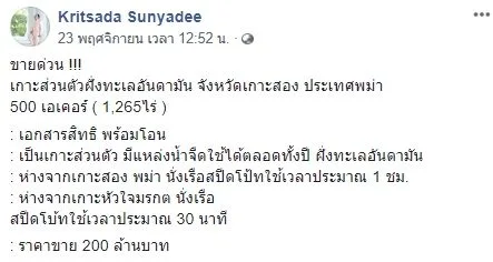 ฮือฮา หนุ่มโพสต์ประกาศขายเกาะส่วนตัวฝั่งทะเลอันดามัน 1 พันกว่าไร่ ราคา 200 ล้านบาท