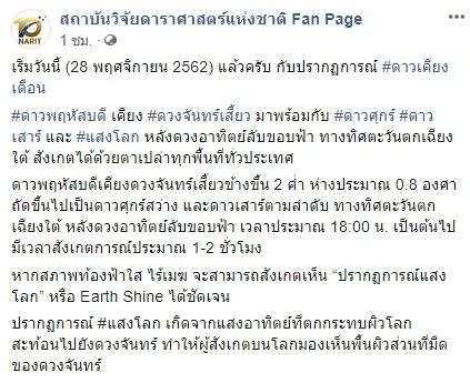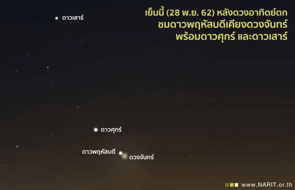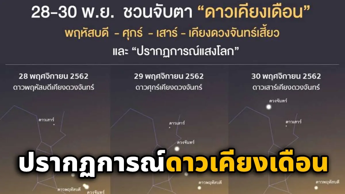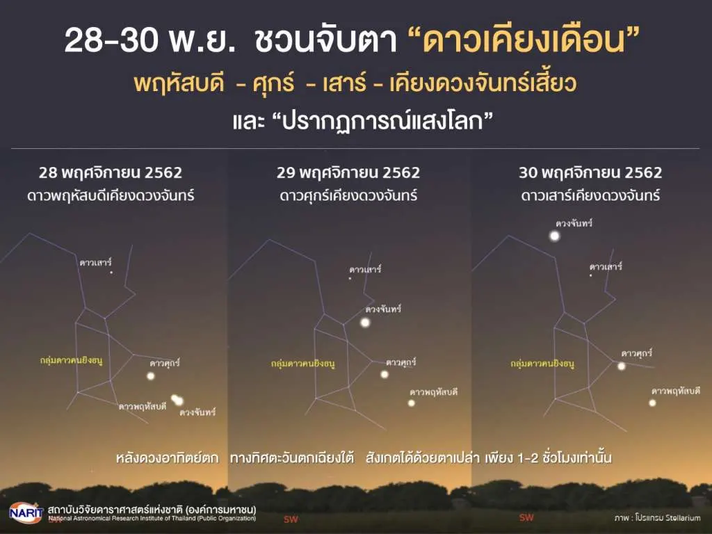 เมื่อวันที่ 28 พฤศจิกายน 2562 เพจ สถาบันวิจัยดาราศาสตร์แห่งชาติ Fan Page ได้ระบุข้อความว่า..เริ่มวันนี้ (28 พฤศจิกายน 2562) แล้วครับ กับปรากฏการณ์ ดาวเคียงเดือน