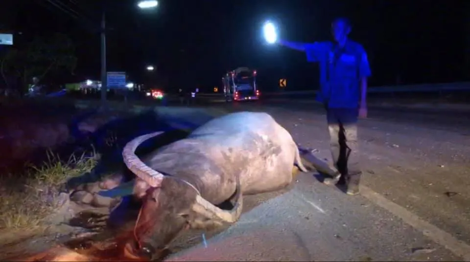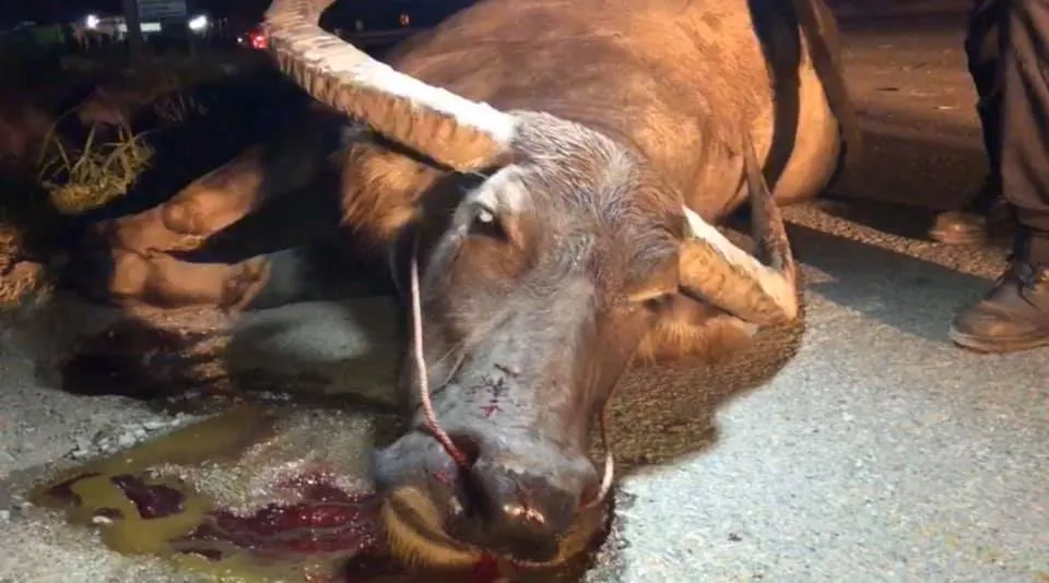 เกิดเหตุสุดสลด ควายท้องแก่หลุดออกมาจากคอกเดินฝ่าความมืดข้ามถนนทำให้ที่วิ่งมาด้วยความเร็วพุ่งชนเข้าอย่างแรงทำให้ควายท้องแก่ตายคาที่และอีก 1 ตัวบาดเจ็บสาหัสส่วนรถพังยับ 2 คัน