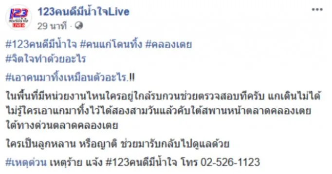 “123คนดีมีน้ำใจ คนอายุมากโดนทิ้ง คลองเตย จิตใจทำด้วยอะไร เอาคนมาทิ้งเหมือนตัวอะไร ในพื้นที่มีหน่วยงานไหนใครอยู่ใกล้รบกวนช่วยตรวจสอบทีครับ แกเดินไม่ได้ไม่รู้ใครเอาแกมาทิ้งไว้ได้สองสามวันแล้วคับใต้สพานหน้าตลาดคลองเตยใต้ทางด่วนตลาดคลองเตย ใครเป็นญาติ ช่วยมารับกลับไปดูแลด้วย”