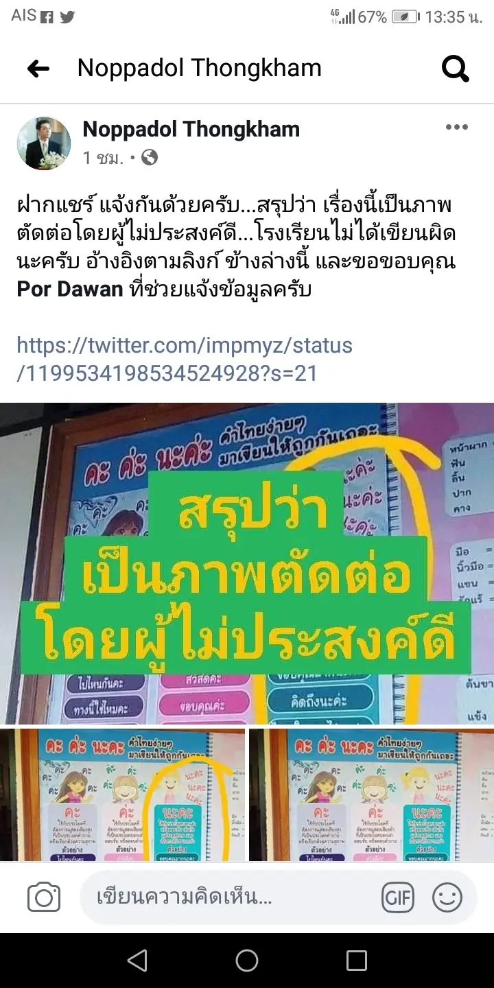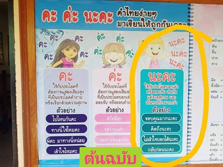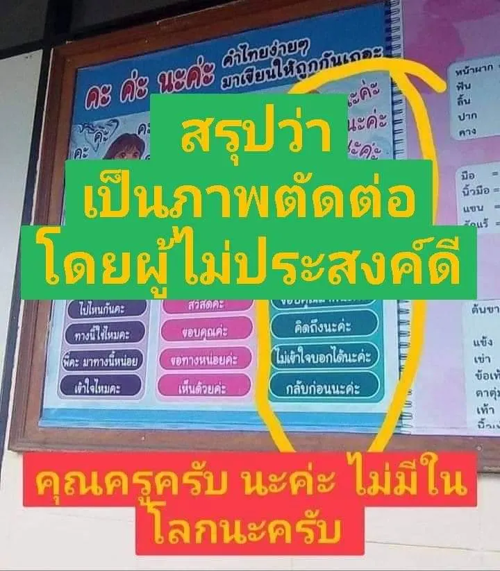 คะ ค่ะ และ นะคะ ในภาษาไทยให้ถูกต้องนั้น แท้จริงแล้วภาพจากโปสเตอร์บอร์ดนั้น มีการเขียนและอธิบายการใช้ คะ ค่ะ นะคะ ได้อย่างถูกต้อง แต่มีมือดีนำมาตัดต่อเพื่อเรียก ให้คนเข้ามาดูเยอะๆ จนเกิดดร่าม่าไปทั่ว ยอกเลยว่าทำแบบนี้ไม่ดีนะคะ ถือเป็นการยิดเยือนข้อเท็จจริง สร้างความเสียหายให้กับผู้อื่น