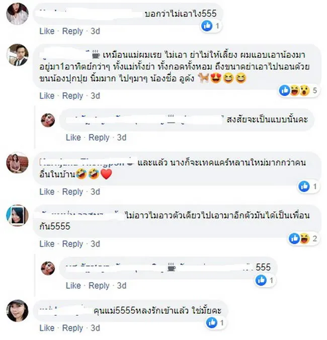 หลังจากที่เธอโพสต์เรื่องราวก็มีชาวเน็ตเป็นจำนวนมากเข้ามาคอมเม้นท์ว่าเหมือนคุณพ่อและคุณแม่ที่บ้านเหมือนกัน เพราะตอนแรกก็ออกแนวบ่นๆว่าเอามาเลี้ยงทำไม แต่หลังๆมารักยิ่งกว่าลูกแท้ๆซะอีก ส่วนคุณแม่ของเธอในเรื่องราวนี้ก็ได้รับการชื่นชมถึงความน่ารักไปแบบเต็มๆเลยล่ะ