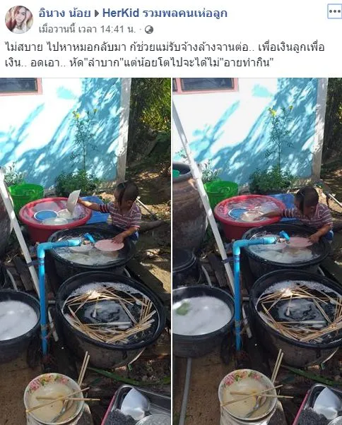 โดผู้ใช้เฟซบุ๊กท่านนี้ยังระบุข้อความประกอบอีกว่า … ไม่สบาย ไปหาหมอกลับมา ก็ช่วยแม่รับจ้างล้างจานต่อ.. เพื่อเงินลูกเพื่อเงิน.. อดเอา.. หัด”ลำบาก”แต่น้อยโตไปจะได้ไม่”อายทำกิน”