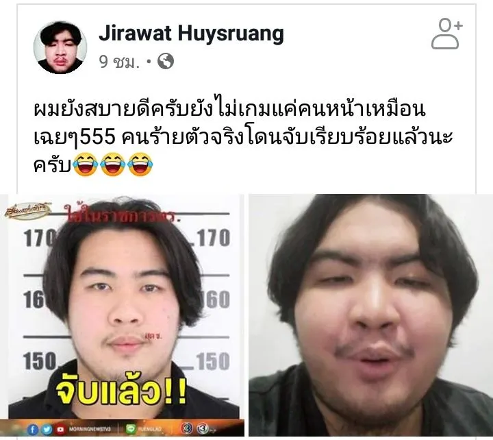 ข่าวใหญ่นาทีนี้คงหนีไม่พ้นสังหารโหดสองสามีภรรยา ชิงรถดูคาติ และตำรวจสามารถตามจับตัวคนร้ายได้แล้ว แต่สิ่งที่หนึ่งที่เกิดขึ้นจากคดีนี้ คือภาพบัตรประชาชนของคนร้าย ดันไปเหมือนกับ น้องผู้ชายที่ใช้ชื่อเฟซบุ๊ค Jirawat Huysruang จนน้องต้องออกมาอัดคลิปเพื่อชี้แจงผ่านเฟซบุ๊คของตนเองว่า ผมแค่นะหน้าเหมือน หน้าโหด แต่ไม่ใช่คนร้ายนะครับ