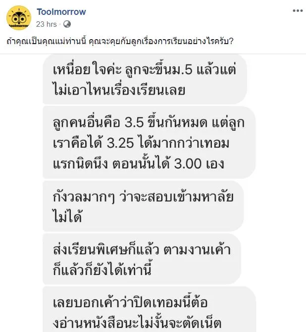 ปัญหาเรื่องการเรียน สะท้อนมาถึงปัญหาในครอบครัว ซึ่งสังคมเมืองไทย เเน่นอนว่า ผู้ปกครองส่วนใหญ่ มักจะให้ความสำคัญกับผลการเรียน เกรดของลูกๆเป็นอย่างมาก จะต้องเเข่งขันให้ได้เกรดเฉลี่ยเยอะๆ เป็นตัวชี้วัดสำคัญในเรื่องการเรียนเก่งของลูกๆ ซึ่งในกรณีที่จะนำเสนอต่อไปนี้ คุณเเม่ท่านหนึ่งได้มีปัญหาทุกข์ใจ เรื่องผลการเรียนของลูกสาว ที่ได้น้อยกว่าเพื่อนๆ จนมาเเชทปรึกษาหาเเนวทาง เเละทางออก สำหรับเรื่องราวดังกล่าว ดังต่อไปนี้ จนเกิดกระเเสวิพากษ์วิจารณ์ในโลกออนไลน์ตามมาอย่างมากมาย