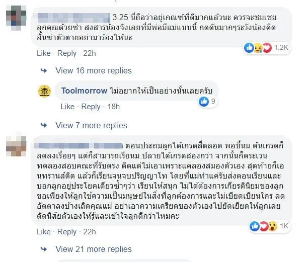 ด้านความคิดเห็น คอมเม้นต์ของผู้คนในโลกออนไลน์เกี่ยวกับกรณีดังกล่าว ก็ได้มีอย่างมากมาย เรื่องของผลการเรียนนั้น อาจจะไม่ใช่ตัดชี้วัดที่สำคัญที่สุด ที่ลูกได้เกรดขนาดนั้น ก็ถือว่าเยอะเเล้วถ้าดูเคสนี้แล้ว ควรตัดเน็ตแม่ก่อนเลยครับ ตามด้วยดัดนิสัยแม่ด้วย ก็เป็นผลดีต่อลูก แต่ถ้าเกิดผมเป็นลูกผมจะไม่ค่อยอยากคุยกับแม่เท่าไหร่ เหมือนคุยแล้วรู้สึกว่าผู้ใหญ่ฝากความหวังความกดดันตลอดเวลา ก็ไม่อยากคุย