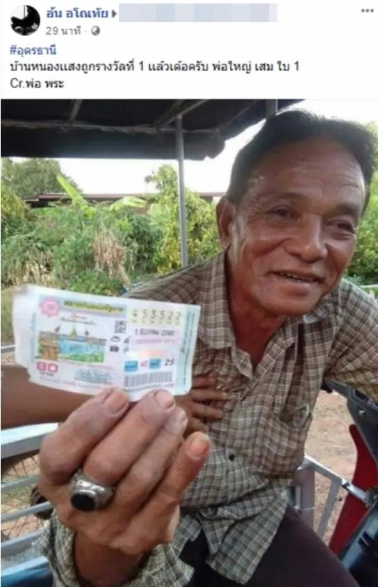 ล่าสุดผู้ใช้เฟซบุ๊ก อ้น อโณทัย โพสต์ข้อความระบุว่า “อุดรธานี บ้านหนองเเสงถูกรางวัลที่ 1 เเล้วเด้อครับ พ่อใหญ่ เสม ใบ 1 Cr.พ่อ พระ”
