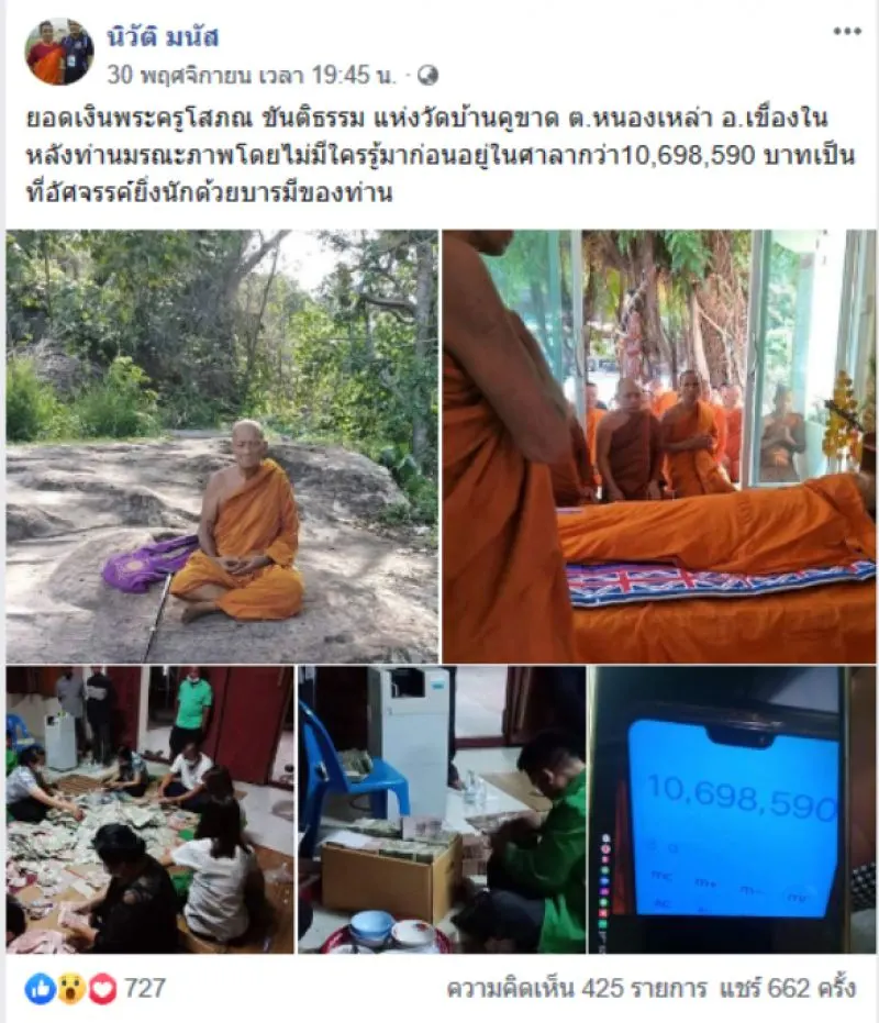 วันที่ 2 ธันวาคม 2562 ทีมข่าวสยามนิวส์รายงานว่า โลกออนไลน์มีการส่งต่อภาพเหตุการณ์ของผู้ใช้เฟซบุ๊กชื่อ นิวัติ มนัส ซึ่งได้โพสต์ถึง พระครูโสภณ ขันติธรรม แห่งวัดบ้านคูขาด โดยผู้ใช้เฟซบุ๊กดังกล่าวระบุข้อความว่า ยอดเงินพระครูโสภณ ขันติธรรม แห่งวัดบ้านคูขาด ตำบลหนองเหล่า อำเภอเขื่องใน หลังท่านมรณะภาพโดยไม่มีใครรู้มาก่อนอยู่ในศาลากว่า 10698590 บาทเป็นที่อัศจรรค์ยิ่งนักด้วยบารมีของท่าน