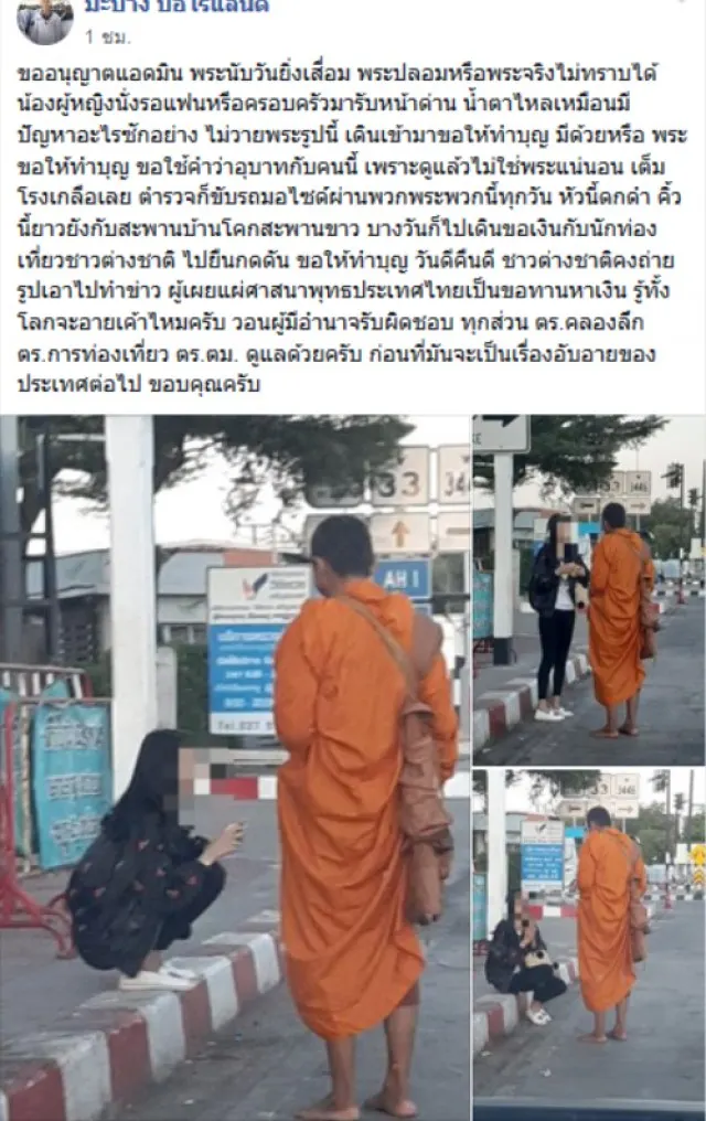 ตำรวจก็ขับรถมอไซด์ผ่านพวกพระพวกนี้ทุกวัน หัวนี้ดกดำ คิ้วนี้ยาวยังกับสะพานบ้านโคกสะพานขาว บางวันก็ไปเดินขอเงินกับนักท่องเที่ยวชาวต่างชาติ ไปยืนกดดัน ขอให้ทำบุญ วันดีคืนดี ชาวต่างชาติคงถ่ายรูปเอาไปทำข่าว ผู้เผยแผ่ศาสนาพุทธประเทศไทยเป็นขอทานหาเงิน รู้ทั้งโลกจะอายเค้าไหมครับ วอนผู้มีอำนาจรับผิดชอบ ทุกส่วน ตร คลองลึก ตร การท่องเที่ยว ตร ตม ดูแลด้วยครับ ก่อนที่มันจะเป็นเรื่องอับอายของประเทศต่อไป ขอบคุณครับ