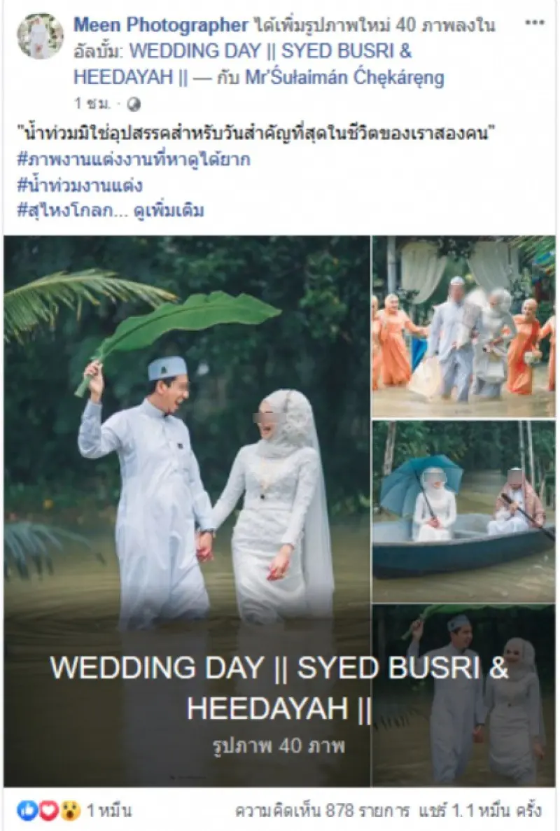 แต่สิ่งที่คาดไม่ถึง ก็เกิดขึ้น เมื่อเกิดฝนตกหนักมาทั้งวันทั้งคืน ทำให้น้ำในแม่น้ำสุไหงโกลกสูงขึ้นอย่างรวดเร็ว แต่ทั้งคู่ ตัดสินใจที่จะไม่เปลี่ยนแปลงเรื่องการจัดงานในวันนี้ ทั้งคู่พร้อมที่จะเดินลุยน้ำ พายเรือ เพื่อรับแขก ญาติพี่น้องและเพื่อนๆ ที่ได้เชิญมาในวันนี้ ทั้งคู่พร้อมยิ้มสู้ไปด้วยกัน ความอดทนของทั้งคู่ที่อัลลอฮ แต่ทั้งคู่ก็พร้อมที่จะจับมือ เดินฝ่าไปด้วยกัน