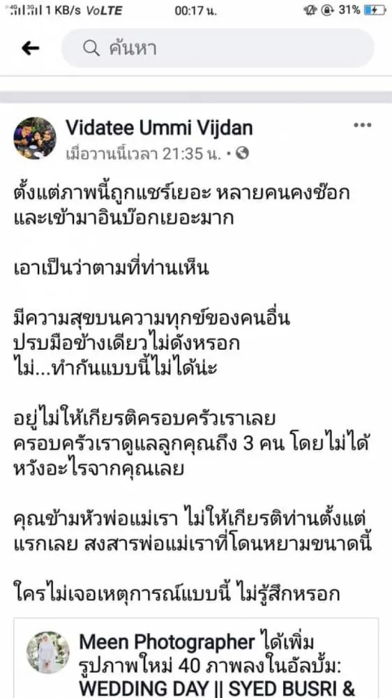 ล่าสุดคดีพลิก หลังจากที่ผู้ใช้เฟซบุ๊ก Vidatee Ummi Vijdan ได้ออกมาโพสต์ข้อความระบุว่า ตั้งแต่ภาพนี้ถูกแชร์เยอะ หลายคนคงช๊อก และเข้ามาอินบ๊อกเยอะมากเอาเป็นว่าตามที่ท่านเห็น มีความสุขบนความทุกข์ของคนอื่น ปรบมือข้างเดียวไม่ดังหรอก ไม่ ทำกันแบบนี้ไม่ได้น่ะ