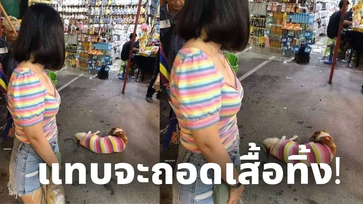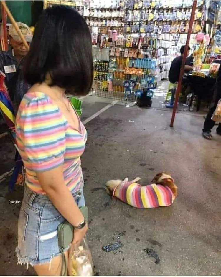 สาววัยรุ่นแต่งตัวสวย สวมเสื้อลายทางสีชมพูสุดหวาน ทว่าขณะเดินเที่ยวอยู่นั้นหางตาเหลือบไปเห็น เจ้าตูบตัวอ้วนนอนอยู่ที่พื้น และที่สำคัญมันใส่เสื้อสีและลายเดียวกันกับเธอเป๊ะๆ