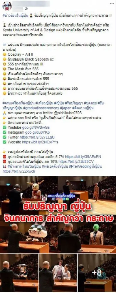 เมื่อจบการศึกษาในมหาวิทยาลัยจะมีพิธีพระราชทานปริญญาบัตรเพื่อแสดงว่าบัณฑิตผู้นั้นได้ได้จบการศึกษาอย่างเป็นทางการแล้ว บัณฑิตทุกท่านจะต้องแต่งตัวให้เรียบร้อย เสื้อผ้า ชุดครุย ทรงผม ต้องอยู่ในระเบียบพิธีพระราชทานปริญญาบัตรเท่านั้น แต่ในประเทศญี่ปุ่นนั้นมีความแตกต่างมากๆ ได้มีเพจในเฟซบุ๊กรายหนึ่งโพสต์ข้อความการรับปริญญาที่ประเทศญี่ปุ่นว่า ข่าวร้อนในญี่ปุ่น รับปริญญาญี่ปุ่น เมื่อจินตนาการสำคัญกว่ากระดาษ เป็นข่าวฮือฮากันอีกครั้ง เมื่อนิสิตมหาวิทยาลัยเกียวโตด้านศิลปะ หรือ Kyoto University of Art Design แต่งตัวตามใจฉัน ขึ้นรับปริญญาจากคณาจารย์ของมหาวิทยาลัย แน่นอน มีคอมเมนต์ตามมามากมายในโลกโซเชียลของญี่ปุ่น ขอยกมาบางส่วน Cosplay Art ฉันชอบชุด Black Sabbath นะ 555 มหาลัยช้านนนน The Mask ก็มา 555 เปิดเสรีด้านไอเดียจริงๆ ฉันชอบมากๆ มีแซวเรื่องแต่งงานด้วย 555 มหาลัยเค้าขายของเก่งจริงๆ อาจารย์บนเวทีต้องใจแข็งพอสมควรเลยนะ 555 พร้อมภาพการแต่งตัวที่แปลกมากๆ