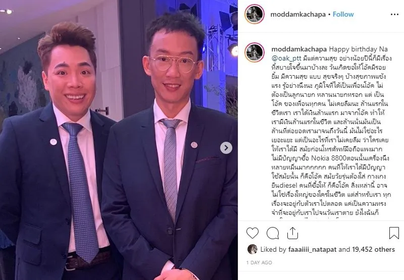 และล่าสุด “มดดำ” ได้อวยพรวันเกิดของ “หนุ่มโอ๊ค” ที่อายุครบ 40 ปี พร้อมเปิดใจร่ายยาวว่า “Happy birthday Na @oak_ptt มีแต่ความสุข อย่างน้อยปีนี้ก็มีเรื่องที้สบายใจขึ้นมาบ้างละ วันเกิดขอให้โอ้คมีรอยยิ้ม มีความสุข แบบ สุขจริงๆ บ้างสุขภาพแข้งแรง รู้อย่างนึงนะ ภูมิใจที่ได้เป็นเพื่อนโอ้ค ไม่ต้องเป็นลูกนายก หลานนายกหรอก แต่ เป็น โอ้ค ของเพื่อนทุกคน ไม่เคยลืมนะ ล้านแรกในชีวิตเรา เราได้เงินล้านแรก มาจากโอ้ค ทำให้เรามีเงินล้านแรกในชีวิต และล้านนั่นมันเป็นล้านที่ต่อยอดเรามาจนถึงวันนี้ มันไม่ใช่อะไรเยอะแยะ แต่เป็นอะไรที่เราไม่เคยลืม ว่าใครเคยให้เราได้มี สมัยก่อนโทรศัพท์มือถือแพงมาก ไม่มีปัญญาซื้อ Nokia 8800ตอนนั้นเครื่องนึงหลายหมื่นมากกกกก คนที่ให้เราได้มีปัญญาใช้สมัยนั้น ก็คือโอ้ค”