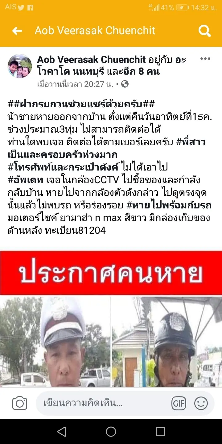 น้าชายหายออกจากบ้าน ตั่งแต่คืนวันอาทิตย์ที่1ธค. ช่วงประมาณ3ทุ่ม ไม่สามารถติดต่อได้