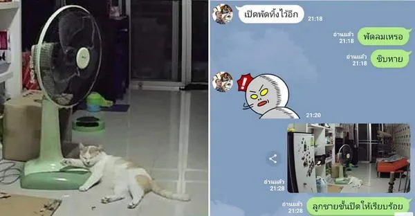 เมื่อผู้ใช้เฟสบุ๊คชื่อว่า SayHi Chayaphon Thanasophon ได้แบ่งปันภาพและเรื่องราวในกลุ่มทาสแมวว่า “ด้วยความที่รีบออกมาข้างนอก จังหวะแฟนดูกล้องผ่านมือถือแล้วเห็นว่่าลืมปิดพัดลม เราก็เปิดกล้องดูมั่งก็อย่างที่เห็นล่ะครับท่านผู้ชม 555”