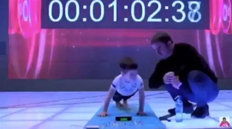 เจ้าหนูน้อยรายนี้มีชื่อว่า Rakhim Kurayev วัย 5 ขวบ จากรัสเซีย เขาสร้างสถิติตโลกบันทึกอย่างเป็นทางการใน Book of Records of Russia ด้วยการ วิดพื้นติดต่อกันแบบไม่พักรวมทั้งสิ้น 3,202 ครั้ง ลายสถิติโลกถึง 6 รายการ ด้วยการวิดพื้นติดต่อกันไม่พัก ไม่รุ้ว่าเจ้าหนูรายนี้เอาพลังมาจากไหน การวิดพื้นใช้เวลาไปทั้งสิ้น 2 ชั่วโมง 22 นาที กับ 9 วินาที คุณลองนึกภาพการวิดพื้นติดต่อกัน 2 ชั่วโมงกว่าแบบไม่พักสิ สุดยอดจริงๆ และด้วยความสามารถขั้นเทพนี้เจ้าหนู Rakhim ได้รับรางวัลให้หยิบสินค้าใดก็ได้ในร้านของเล่นชื่อดังในเมือง
