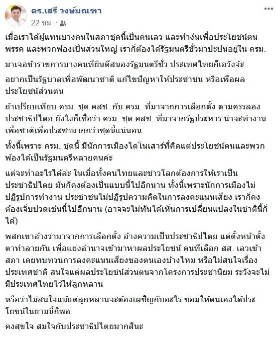 ดร.เสรี วงษ์มณฑา ผู้ร่วมก่อตั้งสถาบันทิศทางไทย และคณาจารย์สถาบันทิศทางไทย นักวิชาการด้านสื่อสารมวลชนและการตลาดได้โพสต์เฟซบุ๊ก เมื่อวันที่ 3 ธ.ค. 2562 แสดงความคิดเห็นต่อสถานการณ์บ้านเมืองว่า “เมื่อเราได้ผู้แทนบางคนในสภาชุดนี้เป็นคนเลว และทำงานเพื่อประโยชน์ตน พรรค และพวกพ้องเป็นส่วนใหญ่ เราก็ต้องได้รัฐมนตรีชั่วมาปะปนอยู่ใน ครม.
