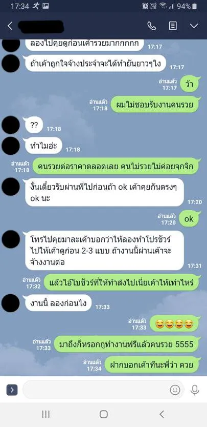 จนกระทั่งถึงช่วงท้ายของการสนทนา ลูกค้าที่อ้างว่ารวยบอกให้ทำโบรชัวร์มาให้ดูก่อน 2-3 แบบ ซึ่งทางฝั่งเจ้าของโพสต์ได้ถามกลับไปว่ามีค่าจ้างสำหรับการทำโบรชัวร์ครั้งนี้หรือไม่ สุดท้ายได้คำตอบกลับมาว่า “งานนี้ ลองก่อนไง” ทำเอาเจ้าของโพสต์ถึงกับรีบปฎิเสธไม่ทัน เพราะแค่มาถึงก็โดน(คนรวย)หลอกให้ทำงานฟรีแล้ว