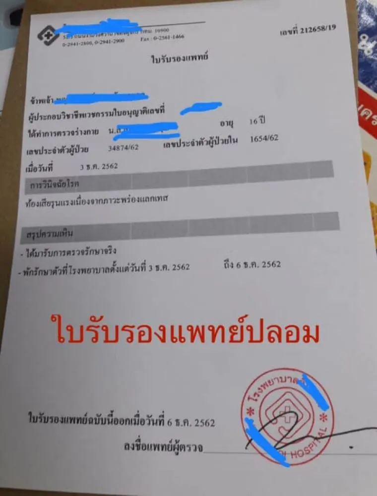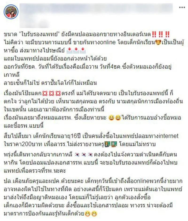 เมื่อไปรับบริการที่โรงพยาบาลหลังจากที่หมอได้ทำการตรวจแล้วจะต้องได้ใบรับรองแพทย์จากสถานพยาบาลเพื่อเป็นการยืนยันอาการป่วยจากแพทย์ที่ทำการตรวจ เมื่อได้รับมาแล้วในกรณีที่เป็นนักเรียน บุคคลทำงาน ก็จะนำใบรับรองแพทย์นี้ไปใช้ยืนยันต่อสถานที่ทำงาน โรงเรียนเพื่อให้รับทราบว่าที่หยุดหยุดไปนั้นเพราะเหตุใด ได้มีผู้ใช้งานเฟซบุ๊กรายหนึ่งโพสต์ข้อความและภาพเตือนผู้ปกครองและทางสถานที่ ให้ตรวจสอบเอกสารทุกครั้งเพราะปัจจุบันได้มีการทำเอกสารปลอมขายในออนไลน์ เพื่อนำไปใช้ประโยชน์ต่างๆ