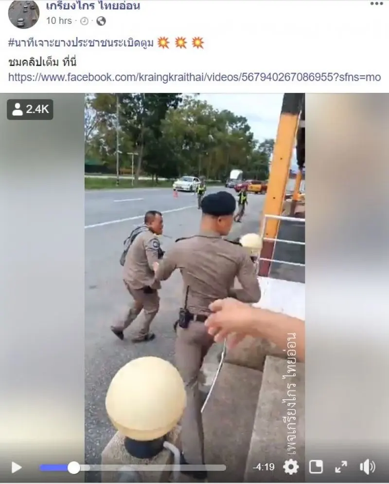 โดยทางเพจ เกรียงไกร ไทยอ่อน ได้เผยคลิปไลฟ์สดเหตุการณ์จากผู้ใช้เฟซบุ๊กรายหนึ่ง เดือด เสียงดังระเบิดตูม ยิงยางรถหรือป่าว ซวยแน่ตำรวจทางหลวงรัตภูมิ ถนน เพชรเกษม รัตภูมิ อำเภอรัตภูมิ จังหวัด สงขลา เดินวนๆๆจนได้เรื่อง ซึ่งรถกระบะคอกขนของได้โดนด่านตำรวจเรียก ซึ่งคนขับก็ได้ลงจากรถมาพบเจ้าหน้าที่นายหนึ่ง มีการท้าทายให้ถ่ายคลิป ยืนตรงให้ประชาชนถ่ายรูปชัดๆกันเลย มีการยึดกุญเเจรถอีกด้วย จากนั้นคนขับได้เดินไปยังบริเวณป้อมตำรวจ ซึ่งก็มีการพูดเจรจากันระหว่าง คนขับกระบะกับเจ้าหน้าที่