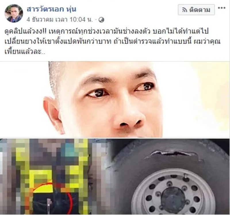 ด้าน สารวัตรเอก หรือ พ ต ท เอกราช หุ่นงาม รอง ผกก.ป.สภ.เมืองประจวบคีรีขันธ์ ได้โพสต์ความเห็นเกี่ยวกับกรณีนี้ว่า ดูคลิปแล้วงง เหตุการณ์ทุกช่วงเวลามันช่างลงตัว บอกไม่ได้ทำแต่ไปเปลี่ยนยางให้เขาตั้งแปดพันกว่าบาท ถ้าเป็นตำรวจแล้วทำแบบนี้ ผมว่าคุณเพี้ยนแล้วละ ซึ่งทำให้ชาวเน็ตต่างเข้ามาแสดงความคิดเห็นกันเป็นจำนวนมาก