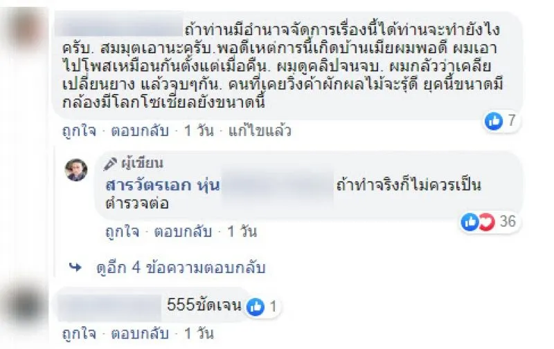 โดยส่วนใหญ่เข้ามาคอมเม้นต์ว่า ใช่ครับท่าน ขอบคุณครับท่านที่อยู่กับความถูกต้อง เช่นทำผิดให้เป็นถูก แบบนี้จะไปสอนลูกให้เป็นคนดีได้ไง บ้างก็เข้ามาคอมเม้นต์ถามสารวัตรเอกว่า ถ้าท่านมีอำนาจจัดการเรื่องนี้ได้ท่านจะทำยังไงครับ สมมติเอานะครับพอดีเหตุการณ์นี้เกิดบ้านเมียผมพอดี ผมเอาไปโพสต์เหมือนกันตั้งแต่เมื่อคืน ผมดูคลิปจนจบ ผมกลัวว่าเคลียร์เปลี่ยนยาง แล้วจบๆกัน คนที่เคยวิ่งค้าผักผลไม้จะรู้ดี ยุคนี้ขนาดมีกล้องมีโลกโซเชียลยังขนาดนี้ ซึ่งทางสารวัตรเอกก็ได้เข้ามาตอบคอมเม้นต์นี้ว่า ถ้าทำจริงก็ไม่ควรเป็นตำรวจต่อ