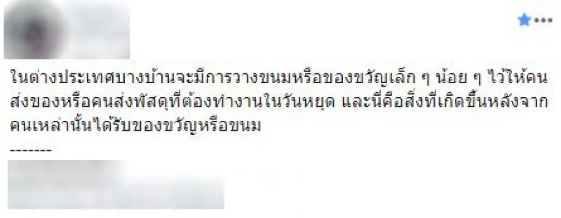 ในการสั่งซื้อสินค้าออนไลน์จะมีบริการส่งสินค้าถึงหน้าบ้านโดยที่ผู้สั่งไม่ต้องไปเดินหาซื้อเอง การจัดส่งจะมีหลากหลายรูปแบบและมีบริษัทขนส่งสินค้าให้เลือกใช้มากมายแต่ละสถานที่ให้บริการก็มีความรวดเร็วแตกต่างกันไป พนักงานที่ส่งสินค้าก็จะมีทั้งรถยนต์และรถจักรยานยนต์จะต้อง ตากแดด ตากฝน ไม่ว่าลูกค้าจะอยู่ไกลแค่ไหนพนักงานก็จะขี่รถไปส่งให้จนถึงมือผู้สั่งซื้อ ได้มีผู้ใช้เฟสบุ๊กเพจหนึ่งที่โพสต์ข้อความว่า ในต่างประเทศบางบ้านจะมีการวางขนมหรือของขวัญเล็ก ๆ น้อย ๆ ไว้ให้คนส่งของหรือคนส่งพัสดุที่ต้องทำงานในวันหยุด และนี่คือสิ่งที่เกิดขึ้นหลังจากคนเหล่านั้นได้รับของขวัญหรือขนม
