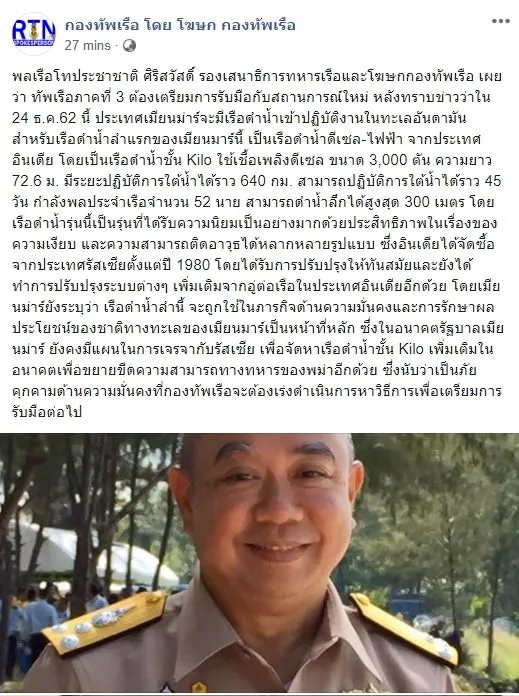 เมื่อวันที่ 7 ธ.ค.ผู้สื่อข่าวรายงานว่า เพจเฟซบุ๊ก “RTN” กองทัพเรือโดยโฆษกกองทัพเรือได้เขียนข้อความถึงทางกองทัพเรือ โดยทัพเรือภาคที่ 3 ให้เตรียมรับมือกับสถานการณ์ใหม่ หลังมีข่าวว่าทางประเทศเมียนมาจะได้รับเรือดำน้ำลำแรกจากประเทศอินเดีย โดยพล.ร.ท.ประชาชาติ ศิริสวัสดิ์ รองเสนาธิการทหารเรือ ในฐานะโฆษกกองทัพเรือ เปิดเผยว่า กองทัพเรือ โดยทัพเรือภาคที่ 3 ต้องเตรียมการรับมือกับสถานการณ์ใหม่ หลังทราบข่าวว่าใน 24 ธ.ค. นี้ ประเทศเมียนมาจะมีเรือดำน้ำเข้าปฏิบัติงานในทะเลอันดามัน