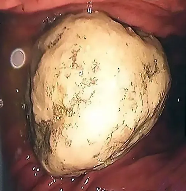 อย่างไรก็ตามเมื่อหมอได้ทำการส่องกล้องตรวจภายในท้องก็พบว่ามีก้อนสิ่งแปลกปลอมขนาด 2 นิ้วอยู่ในกระเพาะอาหารของเธอ และนั่นทำให้เกิดอาการรู้สึกไม่สบายเนื่องจากสิ่งแปลกปลอมนี้มีขนาดที่ค่อนข้างใหญ่