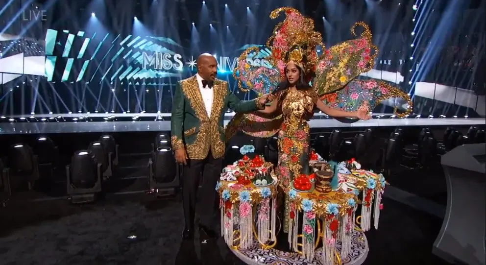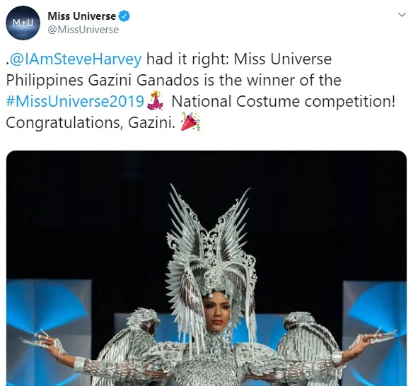 โดย ทวิตเตอร์อย่างเป็นทางการของ Miss Universe ได้โพสต์ภาพ พร้อมทวิตข้อความว่า "@IAmSteveHarvey had it right: Miss Universe Philippines Gazini Ganados is the winner of the #MissUniverse2019 National Costume competition! Congratulations, Gazini" ซึ่งหมายความว่าทาง สตีฟ ฮาร์วี่ย์ ได้ประกาศผู้ที่ได้รับรางวัลชุดประจำชาติยอดเยี่ยมถูกต้องแล้ว