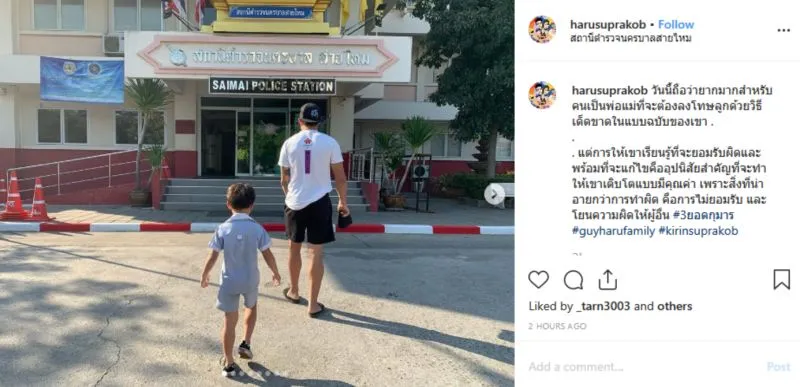 ก่อนสุดท้าย กาย จะจูงมือลูกชายไปโรงพัก โดย ฮารุ โพสต์ภาพ พร้อมแคปชั่นว่า วันนี้ถือว่ายากมากสำหรับคนเป็นพ่อแม่ที่จะต้องลงโทษลูกด้วยวิธีเด็ดขาดในแบบฉบับของเขา แต่การให้เขาเรียนรู้ที่จะยอมรับผิดและพร้อมที่จะแก้ไขคืออุปนิสัยสำคัญที่จะทำให้เขาเติบโตแบบมีคุณค่า เพราะสิ่งที่น่าอายกว่าการทำผิด คือการไม่ยอมรับ และ โยนความผิดให้ผู้อื่น