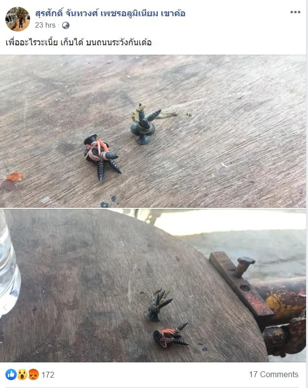 โดยทางผู้ใช้เฟซบุ๊ค สุรศักดิ์ จันทวงศ์ เพชรอลูมิเนียม เขาค้อ ได้โพสต์ภาพตะปูเรือใบที่เจอบนถนน พร้อมข้อความเพื่ออะไรวะเนี้ย เก็บได้ บนถนนระวังกันเด้อ