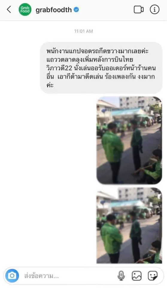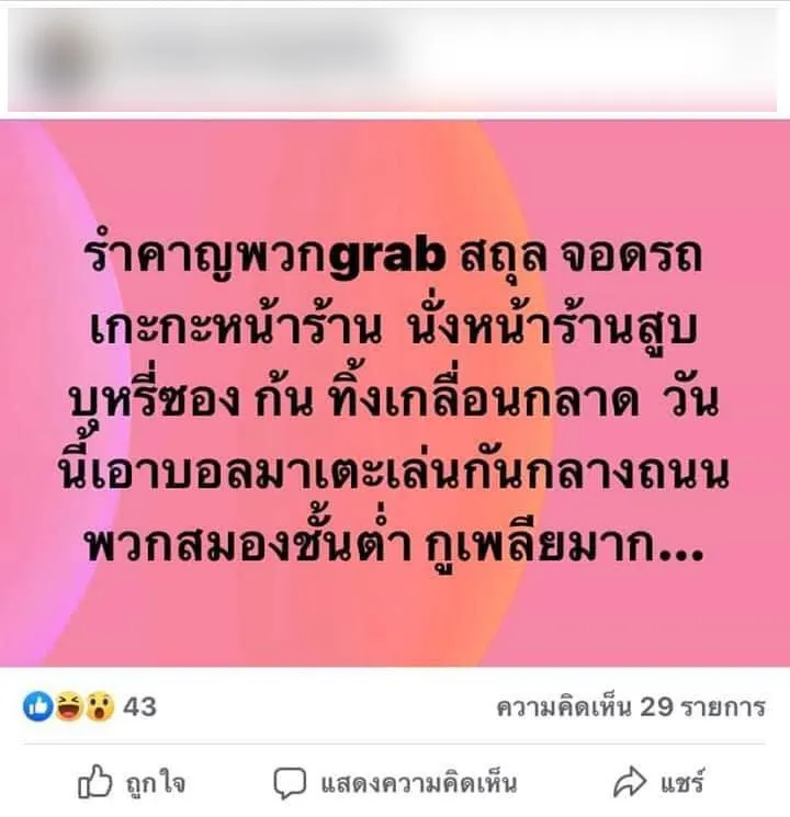 โดยในภาพข้อสาวรายหนึ่งที่ได้โพสต์ภาพ พร้อมระบุข้อความในเชิงเหยียดว่า "รำคาญพวก grab สถุนจอดรถเกะกะ หน้าร้าน นั่งหน้าร้านสูบบุหรี่ซอง ก้นทิ้งเกลื่อนกลาด วันนี้เอาบอลมาเตะกันกลางถนน พวกสมองชั้นต่ำ กูเพลียมาก