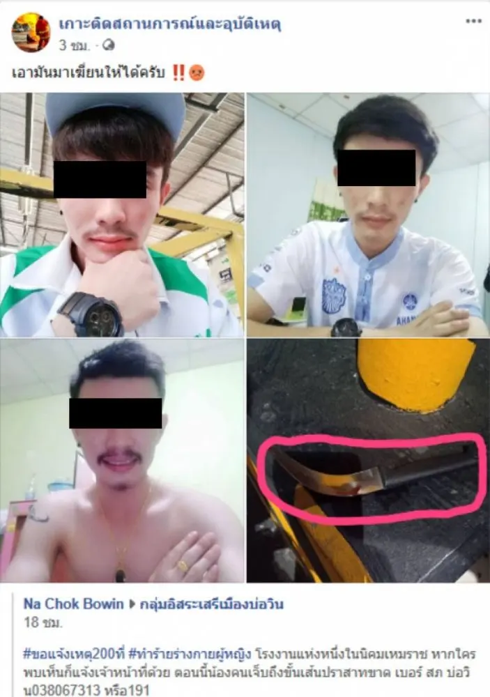 โดยผู้ใช้เฟซบุ๊กชื่อ Na Chok Bowin ได้โพสต์ภาพ พร้อมข้อความลงในกลุ่มว่า ขอแจ้งเหตุ 200 ที่ ทำร้ายร่างกายผู้หญิง โรงงานแห่งหนึ่งในนิคมเหมราช หากใครพบเห็นก็แจ้งเจ้าหน้าที่ด้วย ตอนนี้น้องคนเจ็บถึงขั้นเส้นปราสาทขาด เบอร์ สภ บ่อวิน 038 067313 หรือ 191 รูปผู้ก่อเหตุและอาวุธที่ใช้ คนเจ็บเป็นผู้หญิงในโรงงาน
