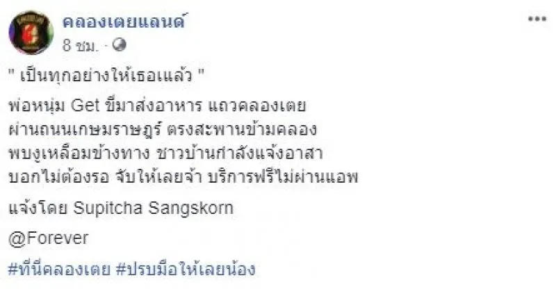 เป็นอีกหนึ่งเรื่องราวที่สร้างความประทับใจให้กับผู้คนเป็นอย่างมาก เมื่อได้มีผู้ใช้เฟซบุ๊กรายหนึ่งโพสต์ข้อความและภาพของหนุ่มขับรถส่งอาหารที่ได้พบกับผู้คนที่กำลังเดือดร้อนเพราะมีงูเหลือมเลื้อยเข้าไปอยู่ในบ้าน ในระหว่างที่รอเจ้าหน้าที่เข้ามาช่วยเหลือ หนุ่มขับรถส่งอาหารตัดสินใจเข้าช่วยเหลือทันที โดยข้อความระบุว่า เป็นทุกอย่างให้เธอเแล้ว พ่อหนุ่ม Get ขี่มาส่งอาหาร แถวคลองเตย ผ่านถนนเกษมราษฎร์ ตรงสะพานข้ามคลอง พบงูเหลือมข้างทาง ชาวบ้านกำลังแจ้งอาสา บอกไม่ต้องรอ จับให้เลยจ้า บริการฟรีไม่ผ่านแอพ