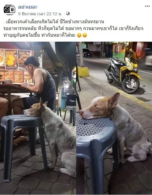 กลายเป็นเรื่องราวสุดสงสารสำหรับคนรักสัตว์ เมื่อเพจเฟซบุ๊ค อย่าเยอะ ได้แชร์เรื่องราวของสุนัขตัวหนึ่งที่กำลังรออาหารจากคนที่กำลังทานอาหารในร้านแห่งหนึ่ง มองจากภาพแล้วดูน่าสงสาร เพราะเจ้าสุนัขตัวนี้นั้นรออาหารจนหลับไปเลย โดยระบุข้อความว่า " เมื่อพวกเค้าเลือกเกิดไม่ได้ ชีวิตข้างทางมันทรมาน รออาหารจนหลับ หิวก็พูดไม่ได้ ขอมากๆ กวนมากๆเขาก็ไล่ เขาก็รังเกียจ ทำบุญกับคนไม่ขึ้น ทำกับหมาก็ได้นะ"
