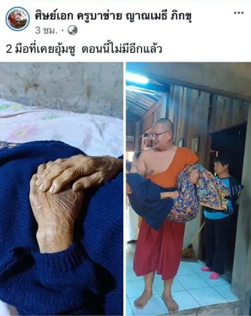 ซึ่งในโพสต์มีภาพของพระภิกษุรูปหนึ่งนั่งเฝ้าหญิงวัยชราที่กำลังป่วยหนัก และภาพถัดมาพระภิกษุรูปดังกล่าวได้อุ้มร่างหญิงวัยชราออกมาจากห้องนอน เมื่อชาวโซเชียลเห็นภาพดังกล่าวต่างเศร้าสลดถึงความกตัญญูของพระภิกษุ