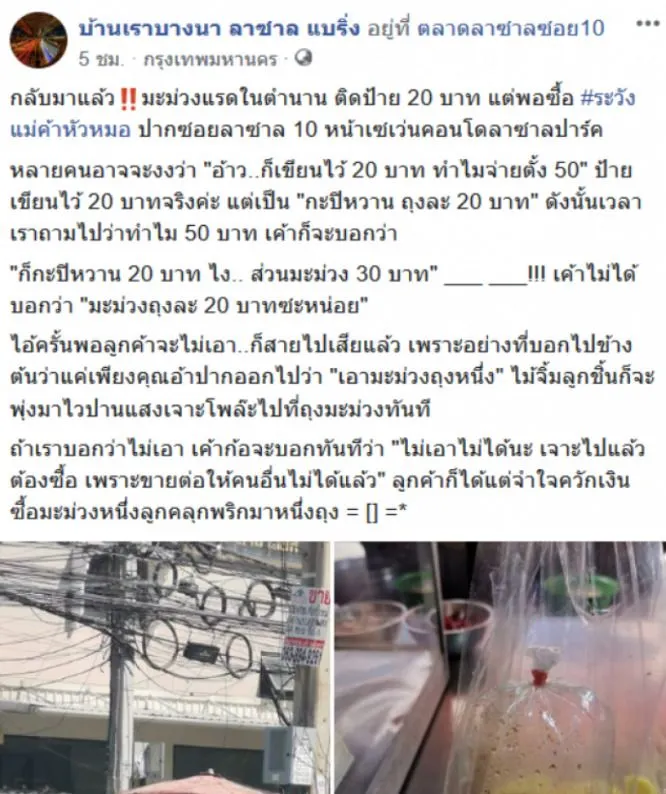 เป็นอีกหนึ่งเรื่องราวที่คนพูดถึงอย่างมาก หลังเพจเฟสบุ๊ค บ้านเราบางนา ลาซาล แบริ่ง ได้โพสต์ข้อความระบุว่า “กลับมาแล้วมะม่วงในตำนาน ติดป้าย 20 บาท แต่พอซื้อ ระวังแม่ค้าหัวหมอ ปากซอยลาซาล 10 หน้าเซเว่นคอนโดลาซาลปาร์ค