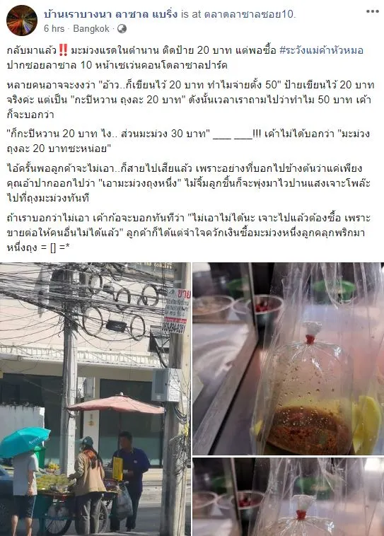 โดยทางเพจ บ้านเราบางนา ลาซาล แบริ่ง เผยว่า กลับมาแล้วมะม่วงแรดในตำนาน ติดป้าย 20 บาท แต่พอซื้อ ระวังแม่ค้าหัวหมอ ปากซอยลาซาล 10 หน้าเซเว่นคอนโดลาซาลปาร์ค