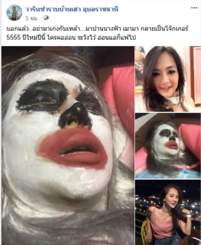 กลายเป็นเรื่องราวที่สร้างรอยยิ้มและเสียงหัวเราะให้กับผู้ที่พบเห็นและชาวโซเชียลจำนวนมาก เมื่อได้มีเพจเฟซบุ๊ค วารินชำราบบ้านเฮา อุบลราชธานี ได้โพสต์ภาพของหญิงสาวที่ก่อนมาสังสรรค์สวยราวนางฟ้า หลังจากสังสรรค์เสร็จต้องกลายเป็นโจ๊กเกอร์เพราะเพื่อนๆจับแต่งหน้านั่นเอง ทำเอาฮาลั่นทั้งโซเชียลเลยทีเดียวจ้า
