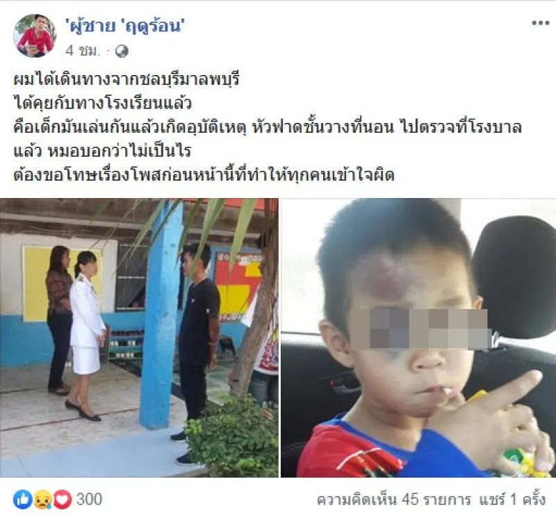 ล่าสุด ผู้เป็นพ่อผู้ชาย ฤดูร้อนโพสต์ข้อความว่า ผมได้เดินทางจากชลบุรีมาลพบุรีได้คุยกับทางโรงเรียนแล้ว คือเด็กมันเล่นกันแล้วเกิดอุบัติเหตุ หัวฟาดชั้นวางที่นอน ไปตรวจที่โรงบาลแล้ว หมอบอกว่าไม่เป็นไรต้องขอโทษเรื่องโพสต์ก่อนหน้านี้ที่ทำให้ทุกคนเข้าใจผิด