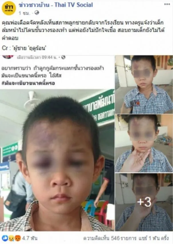 จากกรณีก่อนหน้านี้ เพจ ข่าวชาวบ้าน Thai TV Social ได้โพสต์ภาพพร้อมระบุข้อความว่า “คุณพ่อเดือดจัดหลังเห็นสภาพลูกชายกลับจากโรงเรียน ทางครูแจ้งว่าเด็กล้มหน้าไปโดนชั้นวางรองเท้า แต่พ่อยังไม่ปักใจเชื่อ สอบถามเด็กยังไม่ได้คำตอบ”