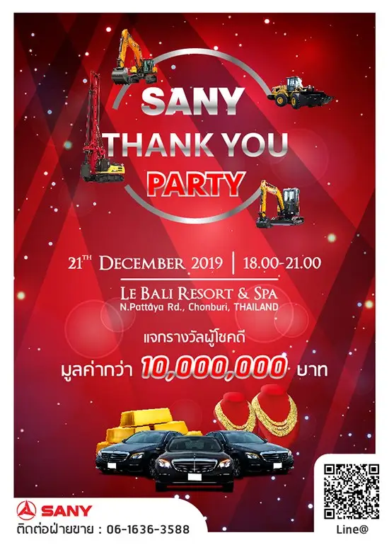 บริษัท ซานี่ ไทยยนต์ จำกัด เตรียมจัดงานใหญ่ส่งท้ายปี “ ก้าวสู่ความยิ่งใหญ่ กับ ซานี่ ไทยยนต์ ” เพื่อฉลองทะลุเป้ายอดขายในปีนี้ รวมถึงเป็นงานเลี้ยงขอบคุณลูกค้าส่งท้ายปี พร้อมเปิดตัวรถขุด ซานี่ รุ่น SY215C-10 นวัตกรรมใหม่ล่าสุด ภายในงานจะมีการแจกของรางวัลมูลค่ากว่า 10 ล้านบาท อาทิเช่น รถ Benz 350E เป็นต้น และสำหรับลูกค้าที่มาร่วมงานรับสิทธิพิเศษ ลุ้นรับรางวัลทองคำ 1 บาท จำนวน 30 รางวัลทันที สำหรับลูกค้าที่เตรียมตัวมาจอ