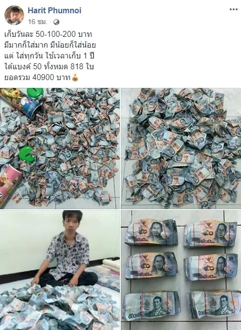 ต้องขอปรบมือให้ในความอดออมของผู้ใช้เฟซบุ๊ก Harit Phumnoi หลังเก็บเงินมาเป็นเวลากว่า 1 ปี จนสามารถรวบรวมเป็นเงินก้อนใช้ได้อย่างสบายเป็นรางวัลในความมานะอดออม ซึ่งเงินที่หนุ่มรายนี้เก็บนั้นเป็นแบงค์ 50 โดยจะเก็บอย่างน้อยวันละ 1 -3 ใบ/วัน