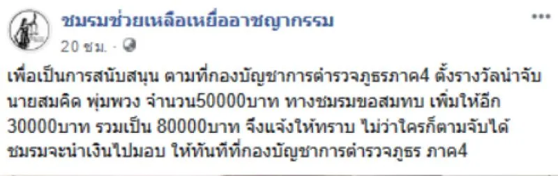 ล่าสุด หลังจากจับ นายสมคิด พุ่มพวง ได้แล้ว ทางเพจก็ออกมาเคลื่อนไหว เตรียมมอบเงิน ให้อีก 30000 ให้แกพลเมืองดี