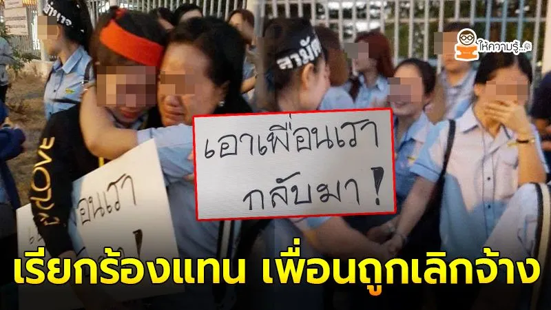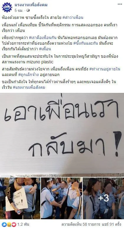 เพจเฟซบุ๊ก แรงงานเพื่อสังคม เผยแพร่บรรยากาศสุดซึ้งหลังสาวๆพนักงานบริษัทแห่งหนึ่งออกมาเรียกร้องแทนเพื่อนร่วมงานที่ถูกเลิกจ้าง ถือป้ายเขียนข้อความว่า “เอาเพื่อนเรากลับมา” ทางเพจระบุ