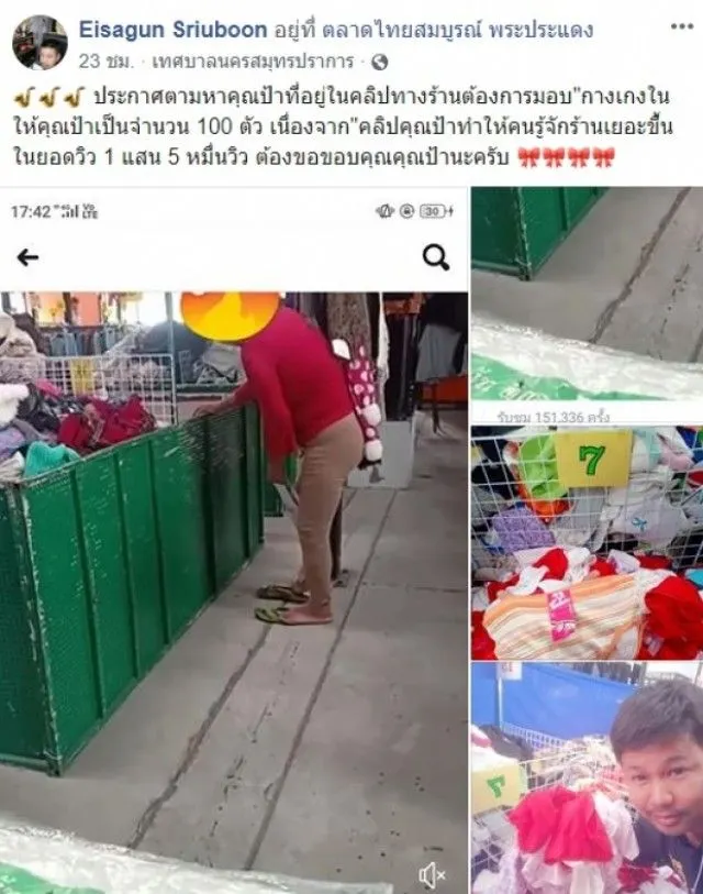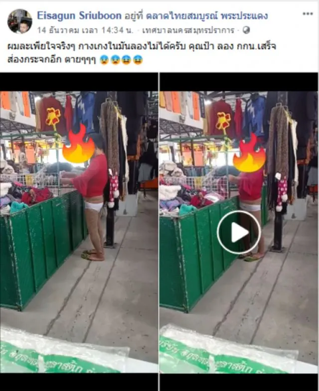 จากกรณีที่คลิปเรียกรอยยิ้ม และเสียงหัวเราะ แถมยังมีการแชร์กระหน่ำในโลกออนไลน์ เมื่อผู้ใช้เฟซบุ๊ก Eisagun Sriuboon ได้เผยคลิปคุณป้าท่านหนึ่ง ยืนเลือกซื้อกางเกงใน โดยการลองสวมใส่ พร้อมทั้งยังส่องกระจกเช็คความเป๊ะอีกด้วย โดยผู้โพสต์ได้ลงเรื่องราวเอาไว้ว่า ผมละเพียรใจจริงๆ กกน มันลองไม่ได้ครับ คุณป้า ลอง กกน เสร็จส่องกระจกอีก